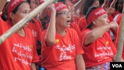 သိမ်းဆည်းခံ ဘိုးဘွားပိုင်မြေများ ပြန်လည်ရရှိရေး ရန်ကုန်မြို့တော်ခန်းမရှေ့မှာ ဆန္ဒပြတောင်းဆိုနေကြသည့် မိကျောင်းကန်လယ်သမားများ (ဓာတ်ပုံ - ဗွီအိုအေမြန်မာပိုင်း)