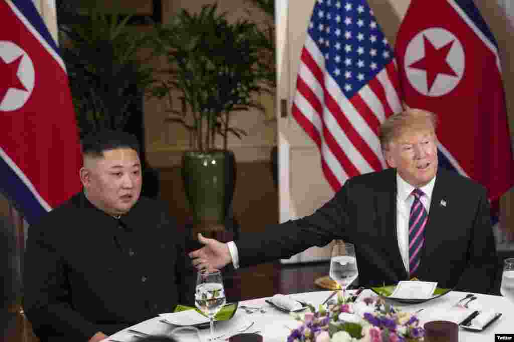 အမေရိကန်သမ္မတ ဒေါ်နယ်လ်ဒ် ထရမ့်ပ်နဲ့ မြောက်ကိုရီးယားခေါင်းဆောင် Kim Jong-un တို့ဟာ ဗီယက်နမ်နိုင်ငံ၊ ဟနွိုင်းမြို့တော်မှာ ဒေသစံတော်ချိန် ဗုဒ္ဓဟူးနေ့ညနေပိုင်းက ဒုတိယအကြိမ် ထိပ်သီးအစည်းအဝေး ပထမရက်အဖြစ် တွေ့ဆုံ ကြပါတယ်။ မြောက်ကိုရီးယားခေါင်းဆောင်က သမ္မတထရမ့်ပ်နဲ့ ထိပ်သီးအစည်းအဝေး အောင်မြင်မယ်လို့ မျှော်လင့်ကြောင်း ပြော ပါတယ်။ သမ္မတထရမ့်ပ်ကလည်း အလားတူမျှော်လင့်ကြောင်းပြောပြီး မြောက်ကိုရီးယားရဲ့ “ကြီးမားတဲ့” စီးပွားရေးအလားအလာ ကို ချီးကျူးပြောဆိုပါတယ်။