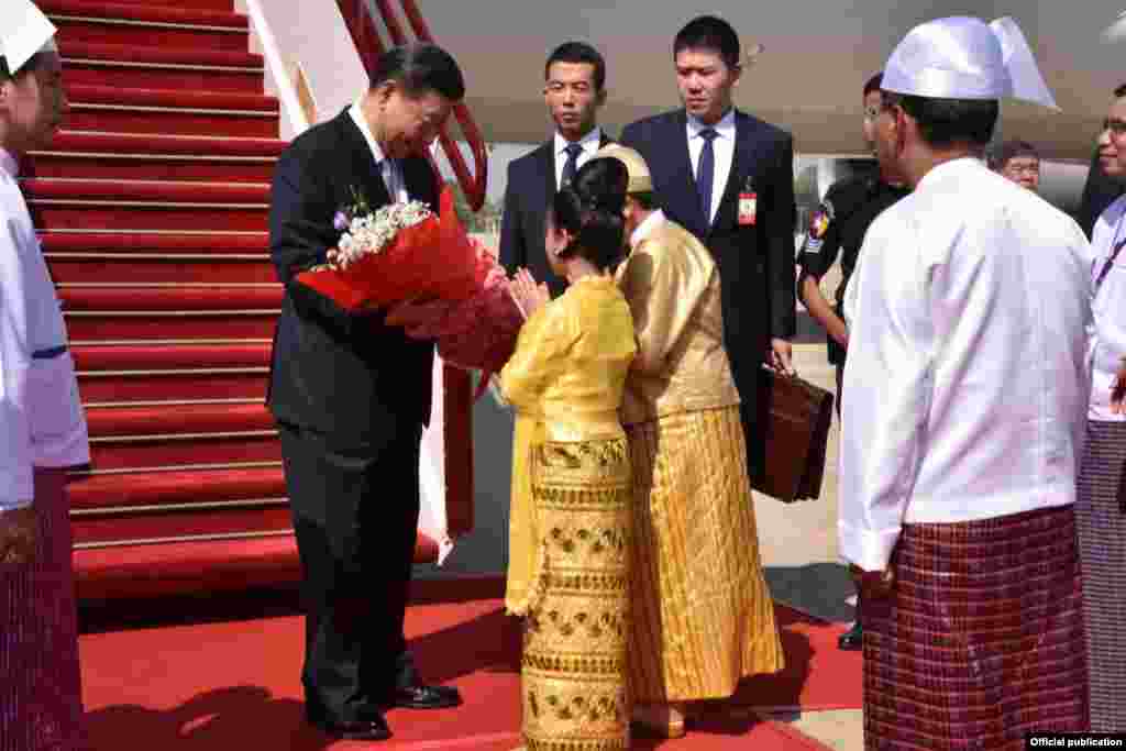 တရုတ်မြန်မာဆက်ဆံရေး အနှစ် ၇၀ ပြည့်အထိမ်းအမှတ်နဲ့ တရုတ်သမ္မတ Xi Jinping မြန်မာနိုင်ငံကို ဒီကနေ့ ရောက်ရှိလာပါတယ်။ နေပြည်တော်ကိုရောက်လာတဲ့ တရုတ်သမ္မတ Xi ကို ဒုသမ္မတ ဦးမြင့်ဆွေက လေဆိပ်မှာ သွားရောက်ကြိုဆိုခဲ့ပါတယ်။ အဲဒီနောက် တရုတ်သမ္မတကို သမ္မတဦးဝင်းမြင့်က သမ္မတအိမ်တော်မှာ ဂုဏ်ပြုတပ်ဖွဲ့နဲ့ လက်ခံ ကြိုဆိုခဲ့ ပါတယ်။ ဒီကနေ့မှာပဲ သမ္မတဦးဝင်းမြင့်နဲ့ တွေ့ဆုံခဲ့သလို တရုတ်သမ္မတ Xi Jingping ဟာ နိုင်ငံတော်အတိုင်ပင်ခံ ဒေါ်အောင်ဆန်းစုကြည်နဲ့လည်း သီးခြားတွေ့ဆုံ နှုတ်ဆက်ခဲ့ပါတယ်။