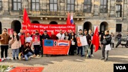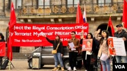 အာဏာသိမ်း စစ်ကောင်စီက အသက်သွင်းလိုက်တဲ့ ပြည်သူ့စစ်မှုထမ်း ဥပဒေကို ဆန့်ကျင်ကြောင်း နယ်သာလန်ရောက် မြန်မာပြည်ဖွား တိုင်းရင်းသားတွေက ပေါင်းစုပြီး အမ်စတာဒမ်မြို့တော်မှာ စနေနေ့က ကန့်ကွက်ခဲ့ကြပါတယ်။ စစ်ခေါင်းဆောင်တွေကို ကာကွယ်ပေးဖို့ လုပ်ဆောင်တဲ့ ဥပဒေဖြစ်လို့ ကန့်ကွက်ရကြောင်း ဒီပွဲကို တက်ရောက်သူ တဦးဖြစ်တဲ့ အမ်စတာဒမ်က မရစ်ချယ်က ပြောပါတယ်။
