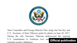 နိုင်ငံတော်၏ အတိုင်ပင်ခံပုဂ္ဂိုလ် နိုင်ငံခြားရေးဝန်ကြီး ဒေါ်အောင်ဆန်းစုကြည်နဲ့ အမေရိကန် နိုင်ငံခြားရေးဝန်ကြီး Rex Tillerson တို့ အင်္ဂါနေ့က တယ်လီဖုန်းနဲ့ဆက်သွယ် ပြောကြားခဲ့ကြပါတယ်။