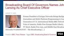 VOA အမေရိကန်အသံကို ကြီးကြပ်စီမံခန့်ခွဲမှု ပေးနေတဲ့ အမေရိကန်ပြည်ထောင်စု အစိုးရ အသံလွှင့်လုပ်ငန်းများဆိုင်ရာ အုပ်ချုပ်ရေးမှုးများဘုတ်အဖွဲ့ BBG ရဲ့ အမှုဆောင်အရာရှိချုပ် အသစ်အဖြစ် Scripps Networks ရဲ့ အကြီးအကဲဟောင်း John Lansing ကို ခန့်အပ်လိုက်ကြောင်း ကြေညာလိုက်ပါတယ်။