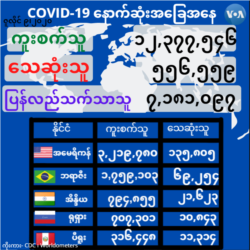 ကမ်ဘာတလှှား ကိုရိုနာဗိုငျးရပျဈ အကူးစကျခံရသူဟာ ၁၂ သနျးကြောျ (၁၂,၁၂၈ ,၄၀၆) သှားပွီလို့ အမရေိကနျ Johns Hopkins တက်ကသိုလျ စဈတမျးမှာ ဖေါျပွထားပါတယျ။