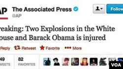ဟက်ကာ အင်တာနက် ခိုးဖောက်ဝင်သူတွေဟာ AP Twitter အကောင့်ထဲကို ဝင်ရောက်ပြီး၊ နောက်ဆုံးရသတင်း - အိမ်ဖြူတော်မှာ ဗုံး နှစ်လုံးပေါက်ကွဲပြီး သမ္မတ အိုဘားမား ဒဏ်ရာရတယ် ဆိုပြီး ရေးသားခဲ့ကြပါတယ်။