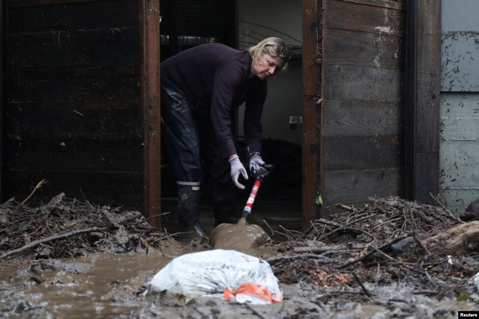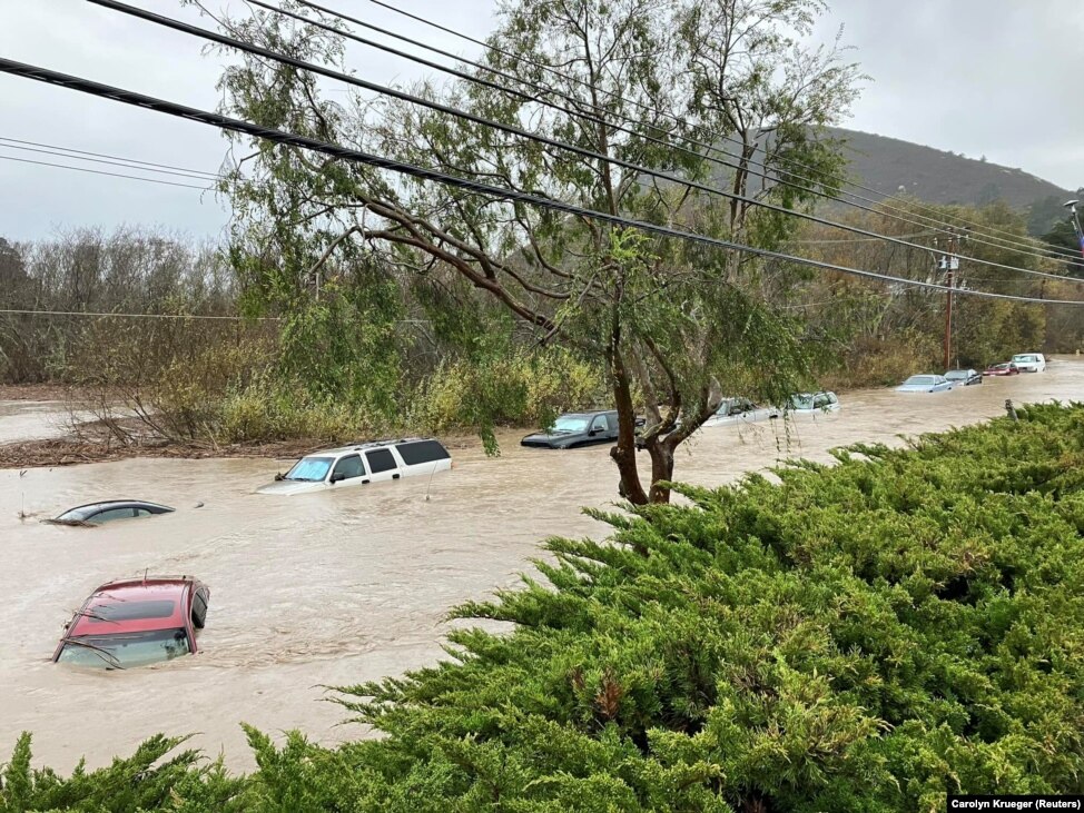 ကယ်လီဖိုးနီးယားပြည်နယ်၊ ဆန်တာ ဘာဘရာမြို့လယ်မှာ နေထိုင်သူတွေ တကိုယ်ရေသုံးပစ္စည်းတွေသယ်ရင်း ရေဘေးလွတ်ရာကို ရွှေ့ပြောင်းနေကြတာဖြစ်ပါတယ်။ (ဇန်နဝါရီ ၉ ၊ ၂၀၂၃)