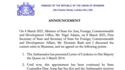 ဒီကြေညာချက်နဲ့ ပတ်သက်လို့ ဗြိတိန်နိုင်ငံ မြန်မာအသိုင်းအဝိုင်းက CDM လှုပ်ရှားမှုကို တက်တက်ကြွကြွအကူအညီပေးနေသူလည်းဖြစ်၊ သံရုံးနဲ့ ညှိုနှိုင်းဆောင်ရွက်နေသူလည်းဖြစ်တဲ့ မြန်မာဆရာဝန် ဒေါက်တာသက်ကိုကို ကို မအင်ကြင်းနိုင်က ဆက်သွယ်မေးမြန်းထားပါတယ်။