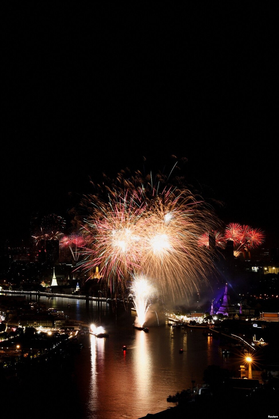 Thailand celebrates the New Year Eve with fireworks over riverside