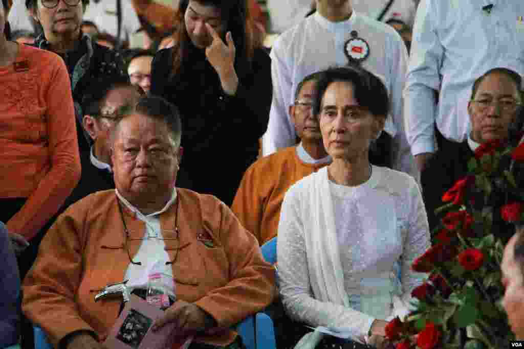 စစ်မှန်တဲ့ ဒီမိုကရေစီနိုင်ငံ ပေါ်ပေါက်လာရေးအတွက် မားမားမတ်မတ်ရပ်တည်ခဲ့တဲ့ ကွယ်လွန်သူ အမျိုးသားဒီမိုကရေစီအဖွဲ့ချုပ်ဥက္ကဌဟောင်း ဦးအောင်ရွှေကို ဂုဏ်ပြုရာမှာ စစ်မှန်တဲ့ ဖယ်ဒရယ်ပြည်ထောင်စုထူထောင်ဖို့ ဝိုင်းဝန်းလုပ်ဆောင်မယ်ဆိုတဲ့ သန္နိဋ္ဌာန်နဲ့ ဂုဏ်ပြုကြဖို့ အမျိုးသားဒီမိုကရေစီအဖွဲ့ချုပ်ခေါင်းဆောင် ဒေါ်အောင်ဆန်းစုကြည်က ပန်ကြားလိုက်ပါတယ်။