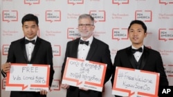 ဒီဇင်ဘာ ၁၂ ရက်နေ့ကတည်းက ဖမ်းဆီး ထိန်းသိမ်းခံထားရပြီး လက်ရှိမှာ နိုင်ငံတော်လျှို့ဝှက်ချက် ဥပဒေနဲ့ တရားရင်ဆိုင်နေရတဲ့ ရိုက်တာသတင်းထောက် ကိုဝလုံးနဲ့ ကိုကျော်စိုးဦးတို့ ၂ ဦးကို နယူးယောက်အခြေစိုက် Pen American အဖွဲ့ကချီးမြင့်တဲ့ Barbey Freedom to Write ဆုချီးမြင့်ပွဲကို မေလ ၂၂ ရက်၊ အင်္ဂါနေ့ညက ကျင်းပခဲ့တာပါ။