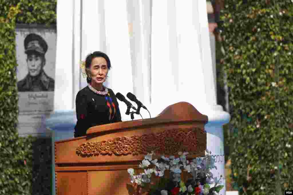 ရှမ်းပြည်နယ်တောင်ပိုင်းပင်လုံမြို့မှာ ဒီကနေ့မနက်ကျင်းပတဲ့ နှစ်၇၀ပြည့် ပြည်ထောင်စုအခမ်းအနားကို နိုင်ငံတော်အတိုင်ပင်ခံပုဂ္ဂိုလ်ဒေါ်အောင်ဆန်းစုကြည်တက်ရောက်ပြီး မိန့်ခွန်းပြောကြားရာမှာ ပင်လုံစာချုပ်နဲ့ ပင်လုံရဲ့ ကတိကဝတ်တွေကို အလေးထားအဓိပ္ပါယ်ဖွင့်ဆိုခဲ့သလို ငြိမ်းချမ်းရေးအတွက် ယုံကြည်ချက်ရှိရှိ ပါဝင်ဆောင်ရွက်ဖို့ အဓိက ထားတိုက်တွန်းထားပါတယ်။