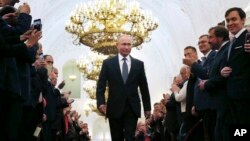 ရုရှားနိုင်ငံမှာ သမ္မတ၊ သို့မဟုတ် ဝန်ကြီးချုပ် ရာထူးတွေကို ၁၉၉၉ ခုနှစ်ကတည်းက စတင် တာဝန်ထမ်းဆောင်ခဲ့တဲ့ Vladimir Putin ဟာ ကရင်မလင် နန်းတော်အတွင်းက လှပစွာ ပြင်ဆင်ထားတဲ့ Andreyevsky ခမ်းမဆောင်မှာ ရွှေနဲ့ကွပ်ထားတဲ့ ဖွဲ့စည်းပုံစာအုပ်ကို ကိုင်ပြီး ၄ ကြိမ်မြောက် သမ္မတအဖြစ် ဒီကနေ့ တနင်္လာနေ့မှာ ကျမ်းသစ္စာ ကျိန်ဆိုလိုက်ပါပြီ။