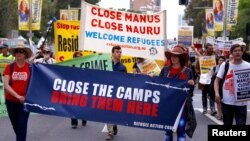 ဆစ်ဒနီမြို့က ဒုက္ခသည်အကူအညီပေးရေးအေဂျင်စီဦးဆောင်တဲ့ ဆန္ဒပြသူတွေ ကတော့ - ဖမ်းဆီးထားတဲ့သူတွေကို သြစတြေးလျနိုင်ငံမှာ အခြေချခွင့်ပေးသင့်တယ်လို့ ပြောပါတယ်။Papua New Guinea နဲ့ Nauru ကျွန်းမှာထိန်းသိမ်းထားတဲ့အထဲက ခိုလှုံခွင့်လျှောက်ထားသူ ၁၂၅၀ ကို လက်ခံဖို့ အမေရိကန်သမ္မတဟောင်း ဘရက်ခ်အိုဘားမားက ပြီးခဲ့တဲ့နှစ်နှောင်းပိုင်းက သဘောတူခဲ့ပြီး၊ သြစတြေးလျကတော့ အမေရိကတိုက်အလယ်ပိုင်းနိုင်ငံတွေကဒုက္ခသည်တွေကို လက်ခံဖို့ သဘောတူခဲ့ပါတယ်။ ပြီးခဲ့တဲ့လကတော့ လူ ၂၀ လောက် အမေရိကန်ပြည်ထောင်စုမှာ ရွှေ့ပြောင်းအခြေချခဲ့ကြပါတယ်။