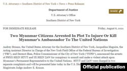 ကုလသမဂ်ဂဆိုငျရာ မွနျမာသံအမတျကွီး ဦးကြောျမိုးထှနျးကို လုပျကွံဖို့ ကွံစညျမှု စှပျစှဲခကြျနဲ့ နယူးယောကျမွို့က မွနျမာနိုငျငံသား ၂ ဦးကို အမရေိကနျ အာဏာပိုငျတှေ ဖမျးဆီးအရေးယူ ထားပါတယျ။ မွနျမာနိုငျငံသားတှေ ဖွဈကွတဲ့ အသကျ ၂၈ နှဈအရှယျ ဖွိုးဟိနျးထှဋျ နဲ့ အသကျ ၂၀ အရှယျ ရဲဟိနျးဇောျ တို့ ၂ ဦးကို သံအမတျကွီးကို လုပျကွံဖို့ ပူးပေါငျးကွံစညျမှုနဲ့ ဖမျးဆီးလိုကျတဲ့အကွောငျး နယူးယောကျ တောငျပိုငျးခရိုငျတရားသူကွီး၊ အမရေိကနျ ပွညျထောငျစု စုံစမျးစဈဆေးရေးဗြုရို (FBI) နယူးယောကျရုံးနဲ့ နယူးယောကျ ရဲတပျဖှဲ့ ကောျမရှငျနာရုံးက သောကွာနေ့မှာ ပူးတှဲကွညောလိုကျတာ ဖွဈပါတယျ။