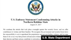 ရခိုင်ပြည်နယ်မြောက်ပိုင်း တိုက်ခိုက်ခံရမှုနဲ့ပတ်သက်ပြီးတော့ ရန်ကုန်အမေရိကန် သံရုံးကလည်း ရှုတ်ချကြောင်း သံရုံးရဲ့ ပြောရေးဆိုခွင့်ရှိသူကပြောပါတယ်။