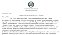 ဇူလိုင်လ ၂ ရက်နေ့မှာ ချမှတ်လိုက်တဲ့ အရေးယူဒဏ်ခတ်မှုဟာ မြန်မာနိုင်ငံကို ဒီမိုကရေစီလမ်းကြောင်းပေါ် ပြန်လျှောက်ဖို့ မလုပ်မချင်း မြန်မာစစ်တပ်နဲ့ စစ်ခေါင်းဆောင်တွေ အပေါ် အမေရိကန်က အရေးယူမှုတွေ ဆက်လုပ်နေမယ်ဆိုတာကို ပြသလိုက်တာ ဖြစ်ကြောင်း အမေရိကန်နိုင်ငံခြားရေးဝန်ကြီး Antony Blinken က သောကြာနေ့မှာ ကြေညာချက် ထုတ်ပြန် သတိပေးလိုက်ပါတယ်။
