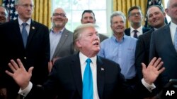 သမ္မတ အိမ်ဖြူတော်မှာ အာလူးစိုက်ပျိုးရေးသမား တွေ၊ နို့ထွက်ပစ္စည်း ထုတ်လုပ်သူတွေ ခြံရံထားတဲ့ သမ္မတက ဒီ ငွေကြေးက အမေရိကန် လယ်ယာတွေကို ကြီးပွားစေမှာ ဖြစ်ပြီး ဘယ်နိုင်ငံကမှ အမေရိကန် စီးပွားရေးနဲ့ အမျိုးသား လုံခြုံရေးအပေါ် ဗီတိုအာဏာ မသုံးနိုင်ဘူးဆိုတာကို ရှင်းရှင်းလင်းလင်း သိစေမယ်လို့ ပြောပါတယ်။