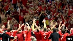 Wales အသင်း အောင်ပွဲခံနေစဉ်။