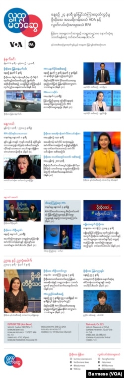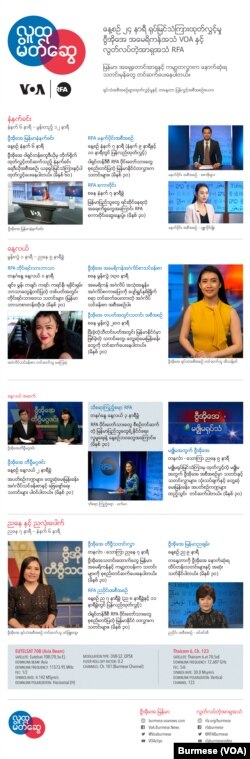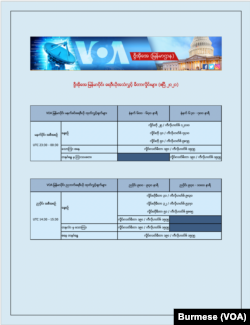 ဗွီအိုအေမြန်မာပိုင်း အသံလွှင့်အစီအစဉ်ကနေ နောက်ဆုံးရ ကမ္ဘာနဲ့ မြန်မာသတင်းတွေ၊ သတင်းဆောင်းပါး၊ သုံးသပ်ချက်နဲ့ ဗဟုသုတရဖွယ် ကဏ္ဍစုံကို တနေ့ကို (၅) ကြိမ် ထုတ်လွှင့်ပေးနေတာကို ဗွီအိုအေ မြန်မာပိုင်း ရေဒီယိုအစီအစဉ်တွေမှာ နားဆင်နိုင်ပါတယ်။ မနက်ပိုင်း အစီအစဉ်တွေကို မြန်မာစံတော်ချိန် မနက် (၆) နာရီကနေ (၇) နာရီ၊ ညနေအစောပိုင်း အစီအစဉ်တွေကို ညနေ (၆) နာရီခွဲကနေ (၇) နာရီ၊ ညပိုင်းအစီအစဉ်ကို ည (၉) နာရီကနေ (၁၀) နာရီအထိ နားဆင်ရမှာပါ။ မနက် (၇) နာရီ၊ (၈)နာရီနဲ့ ညပိုင်း (၁၀) နာရီမှာလည်း တကြိမ်စီ ပြန်လည် ထုတ်လွှင့်ပေးနေပါတယ်။